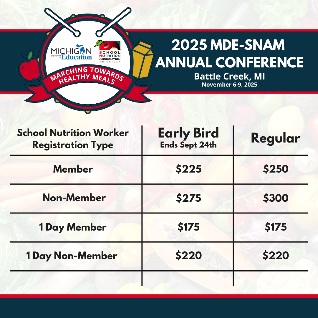 The 2025 MDE-SNAM Annual Conference will be held at the Doubletree by Hilton Battle Creek. The Food Show will be held at the attached Kellogg Arena.
